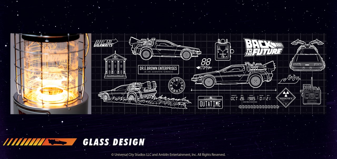 燃焼する炎が見えるガラス部分には、「タイムマシン」をはじめ、劇中に登場するさまざまなアイコンやイラストが設計図風のデザインであしらわれている。