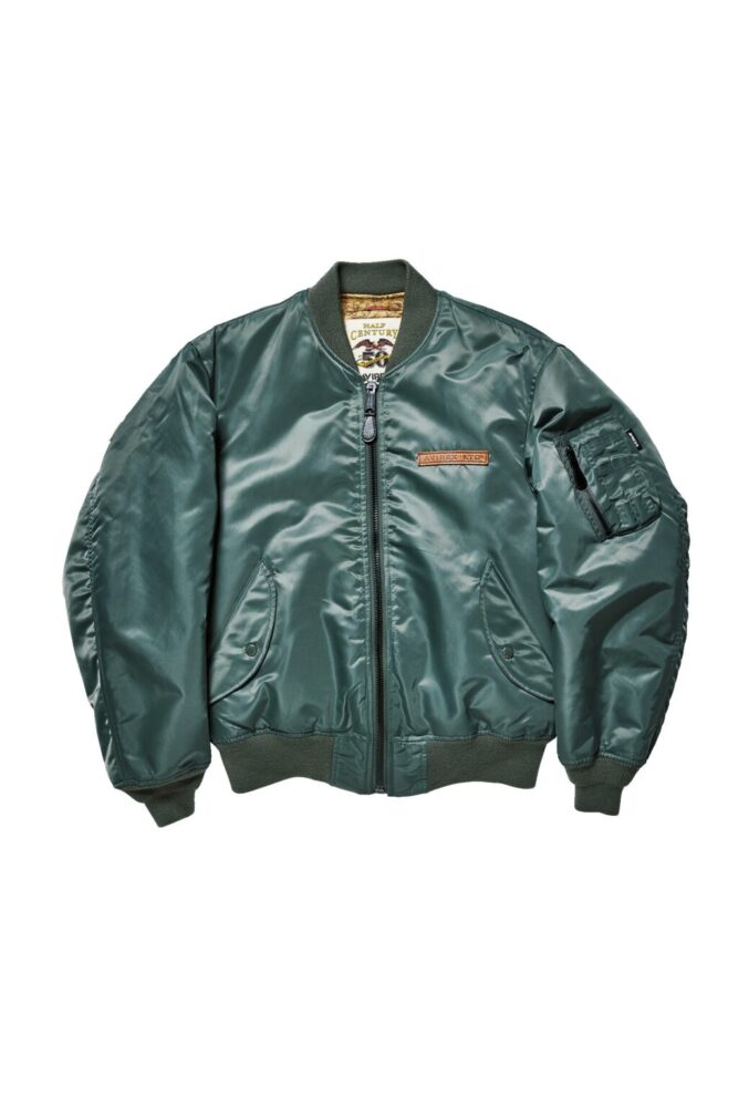 過去にリリースしたアーカイブの中からビッグロゴワッペンのMA-1を復刻。従来に比べてややワイドなシルエットにアレンジを加えており、さらに50周年記念パッチも装備。アウトシェルにはヘビーナイロン、ライニングにはマップ柄を採用したスペシャルモデル。3万9600円