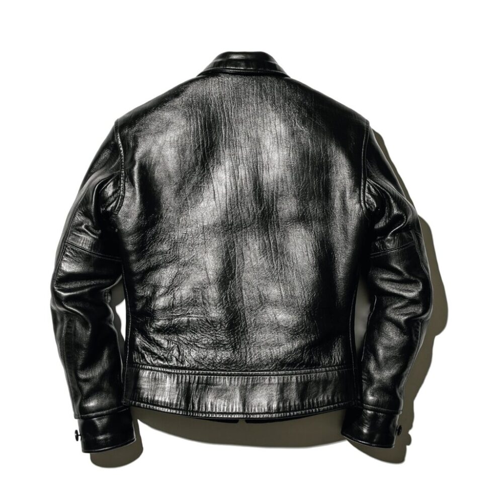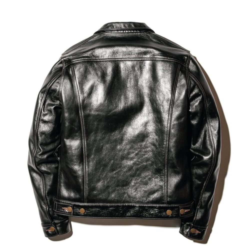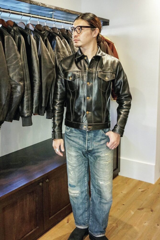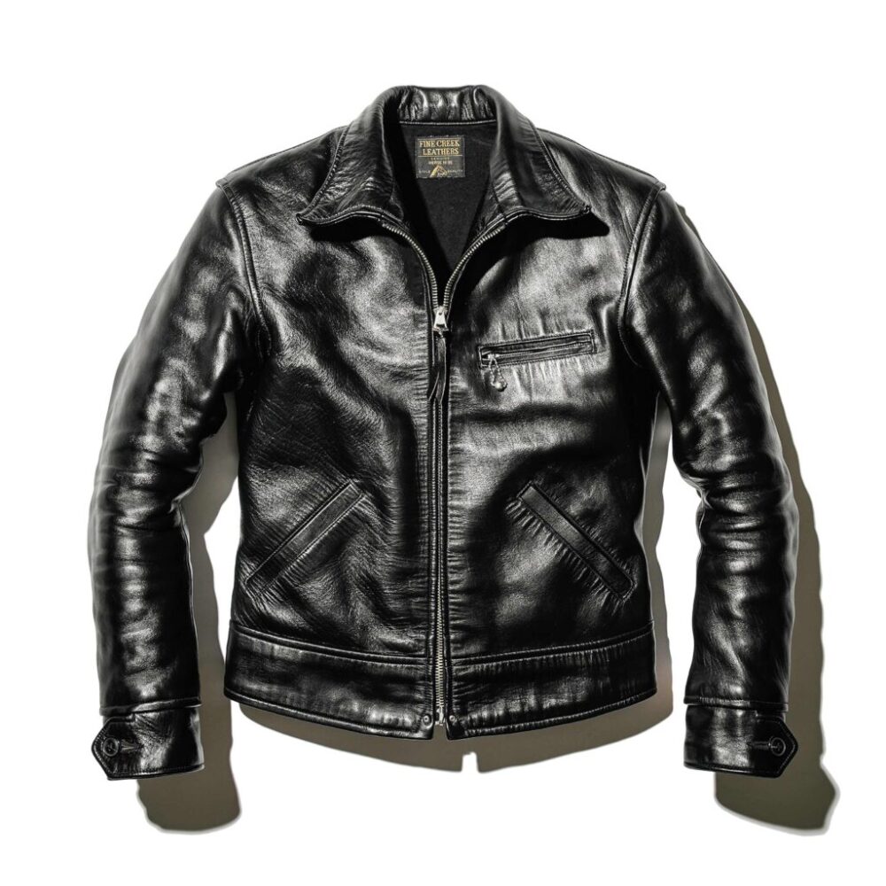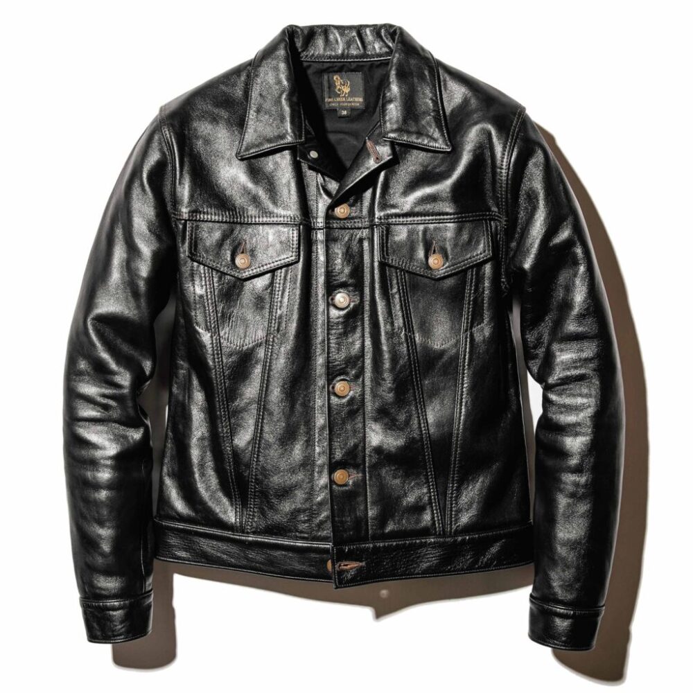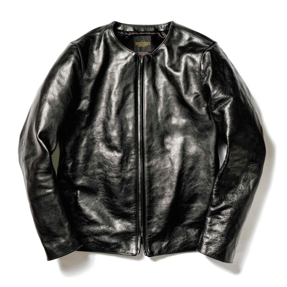 永遠の定番と言われるサードタイプをデザインモチーフに、ホースハイドで再構築したファインクリークレザーズの意欲作。パターンを徹底的に見直し、オリジナルの持つ野暮ったさを一切排している。特に袖の付け方はライダースを踏襲し、若干前付けになっているのが特徴。そのため、脇の下に革の余剰分が出ずに、スタイリッシュに着こなすことができる。フルベジタブルタンニン鞣し・アニリン仕上げの1.2㎜厚の馬革を採用し、着込むほどに艶やかな茶芯が出現する。18万1500円