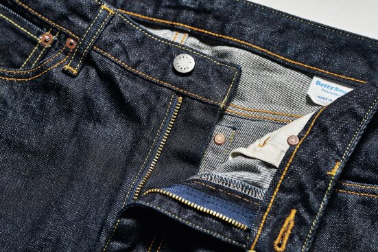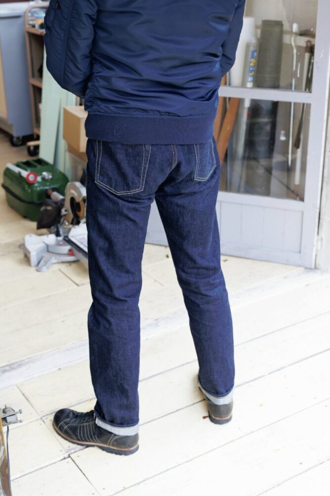 脱ぎ履きしやすいジッパータイプ。14ozの生デニムを採用しているため柔らかく、初心者にもおすすめの一本に仕上がっている。