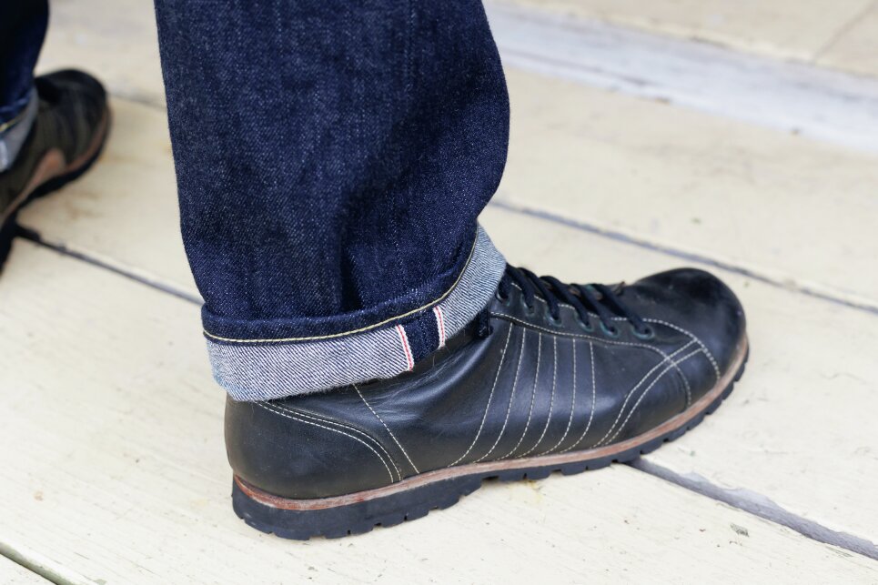 自ら裾上げをしてジャストサイズに調整。少しロールアップすることでアクセントになるだけでなく、セルヴィッチならではの耳の確認もできる。靴は珍しいパトリックのレザーブーツ。