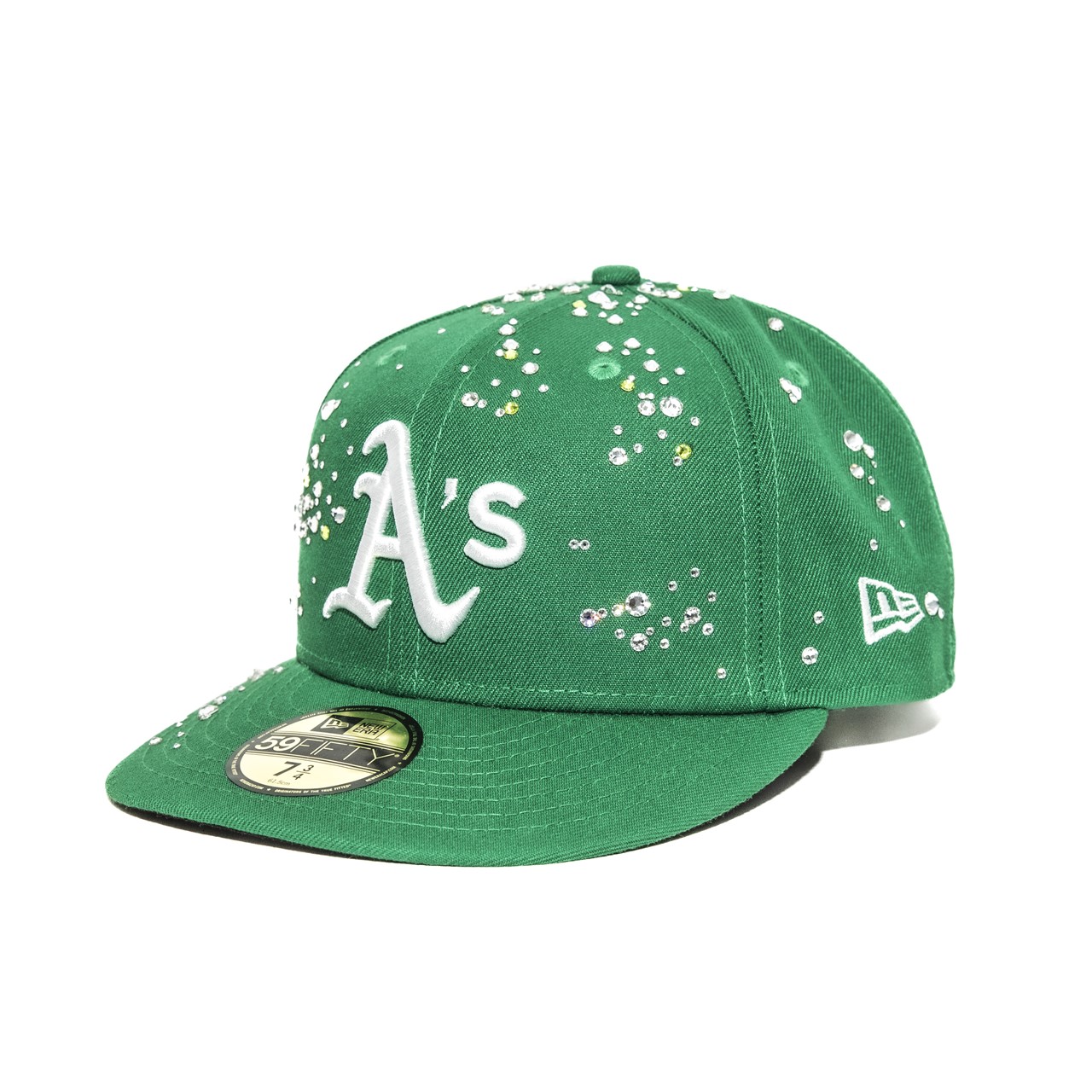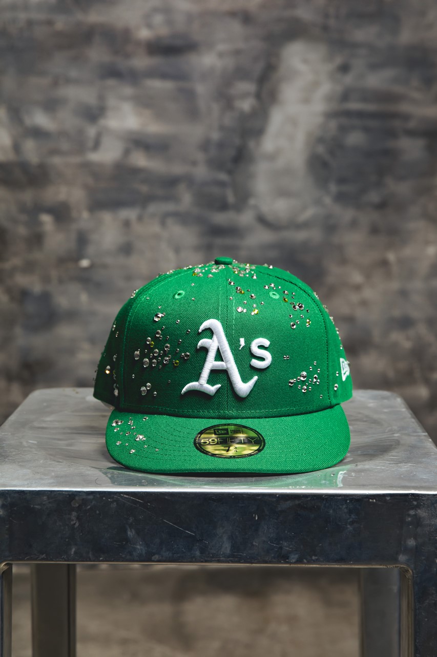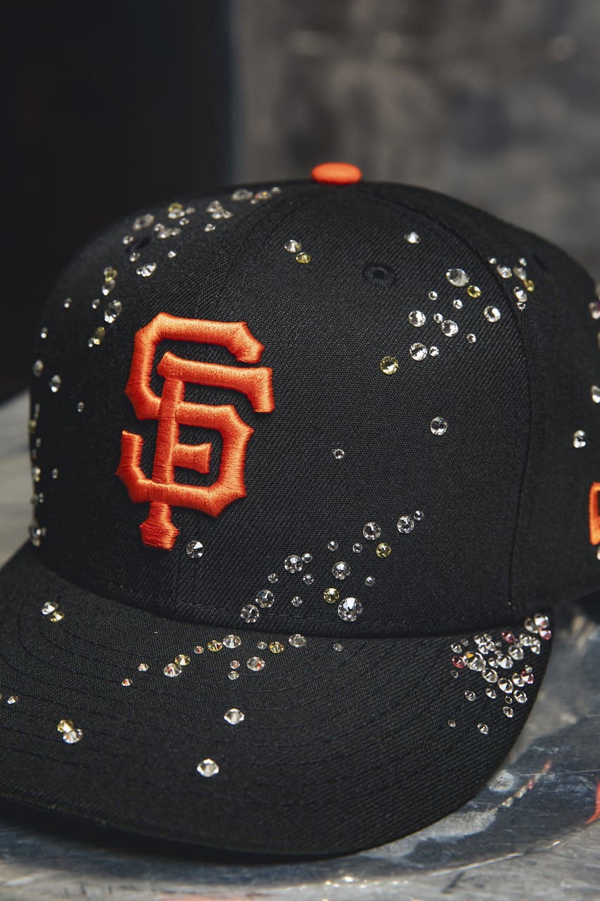 大粒のスワロフスキーをふんだんに使用し、まるで芸術作品のような風格を纏った仕上がり。「Oakland Athletics」と「San Francisco Giants」のベースボールキャップをベースに、Coutureに所属するアーティストが全て手作業で装飾を施している。