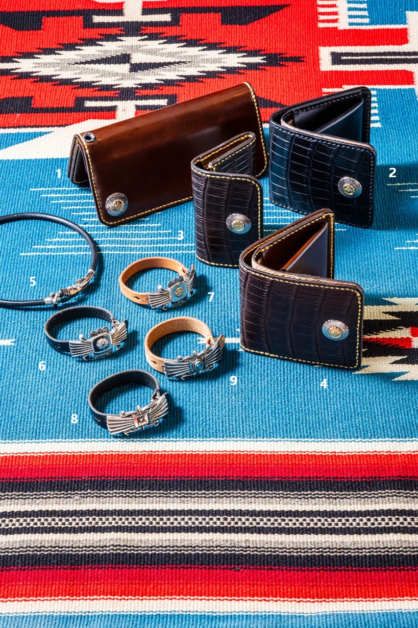 ファーストアローズでは創業時よりレザーアイテムも展開する。素材には革のダイヤモンドと称される馬革のコートバン、高級皮革の代名詞・クロコダイルやイタリア産の最高級の牛革などを使用。さらに、シルバーのコンチョやアクセサリーを組み合わせることでさらなる高級感をプラスした至高の逸品だ。