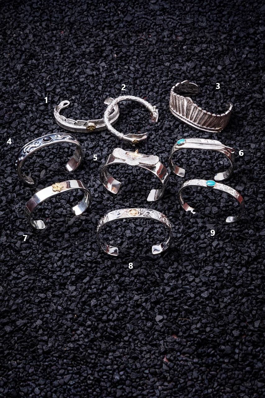 手元にアクセントをもたらす人気のバングルシリーズ。デザインはもとより、太さをはじめ、ターコイズや18金のロゴをあしうことでその印象は大きく変わる。大ぶりなものでワイルドに、シンプルなもので上品に。好みやシーンに応じて使い分けられるようになったら貴方はシルバーの上級者といえるだろう。