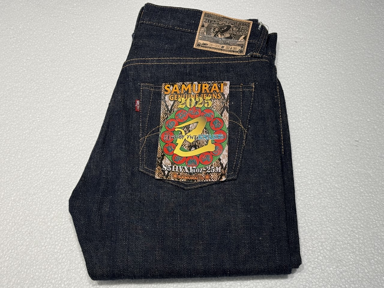 スペシャル限定ジーンズ企画の「干支シリーズ:巳年モデル」。2020年の子年モデルから始まった、年に一度12年にわたるロングラン企画。6作目「巳年」の本モデルも、巳(蛇)をイメージした仕様となっている。零17ozデニムに、オリジナル蛇柄ジャガード生地による袋布、赤塗装ボタン、サムライカモメステッチに赤ピスネームと、スペシャルモデルならではの仕様。シルエットは人気のスリムテーパードS511XX。