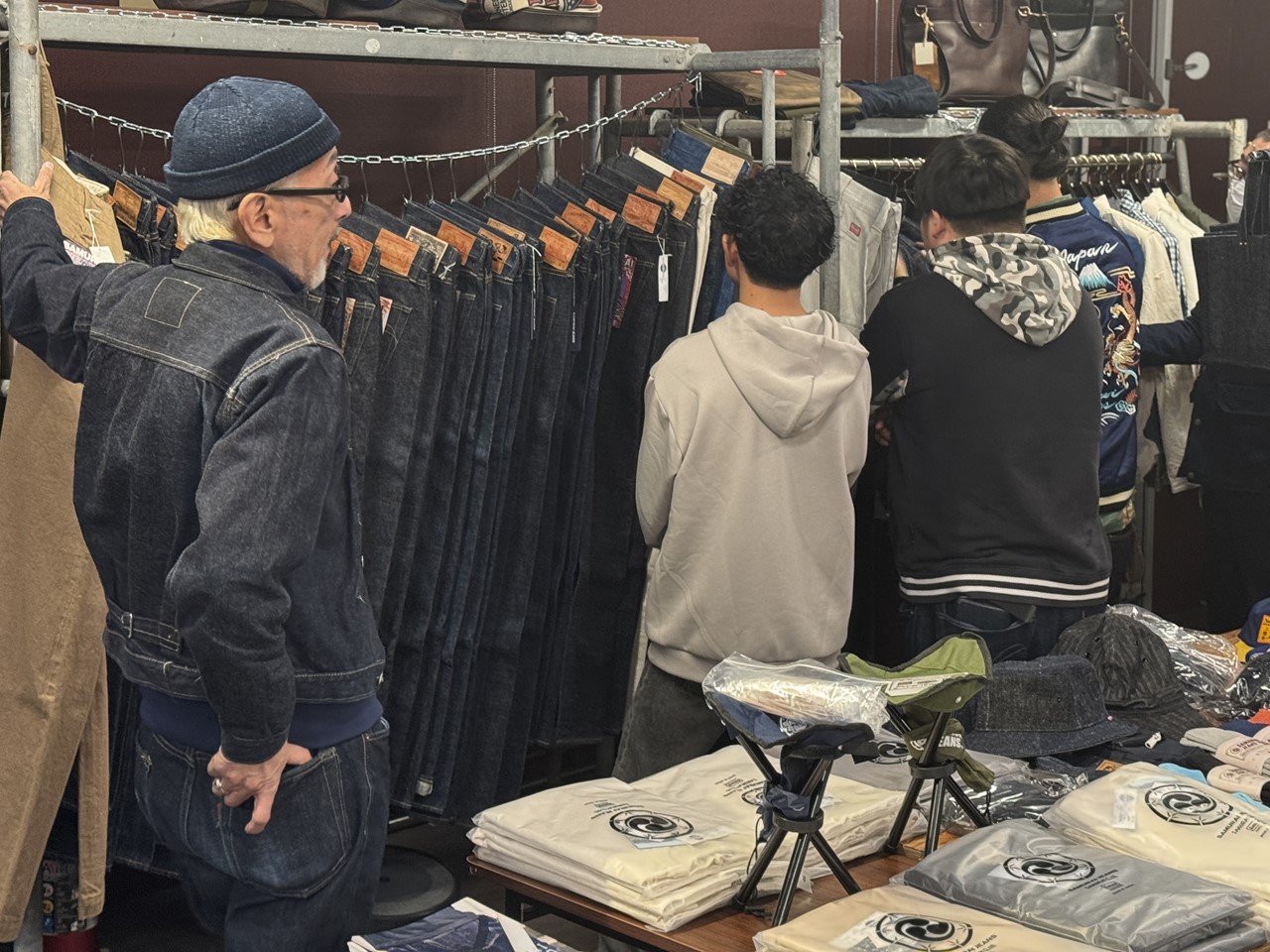 内見会イベントでは、いち早く新作のサンプルを実際に見ること、試着することができ、気に入ったアイテムの予約することもできる。今回もサムライジーンズの野上代表が自ら新作を持ち込んで内見会を開催。多くのファンが訪れ、野上代表との会話を楽しんでいた。