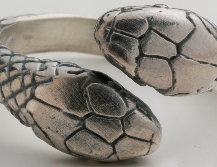 いぶし仕上げで陰影がつくことで、リアルな印象に。フリーサイズで調整することで、スネークヘッドの位置が変わる仕組み。