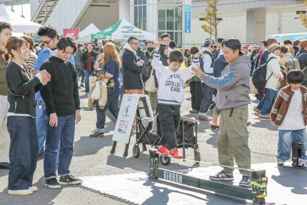 会場内に設置されたスラックライン。子どもたちが順番待ちをするほど人気のエリアになった。上手にできたかな?