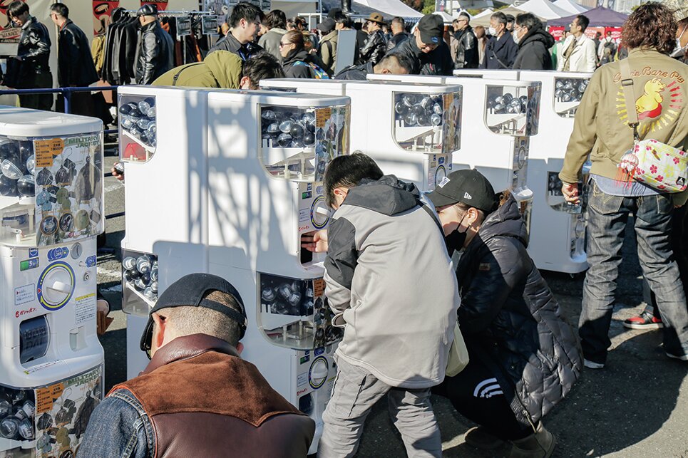 Lightning TOY cllection第一弾のミリタリージャケットキーホルダーのガチャガチャコーナー。A-2やMA-1などの4種類に加えて、レア品としてジョリーロジャースのプリントを施したA-2も。当たったらラッキー!