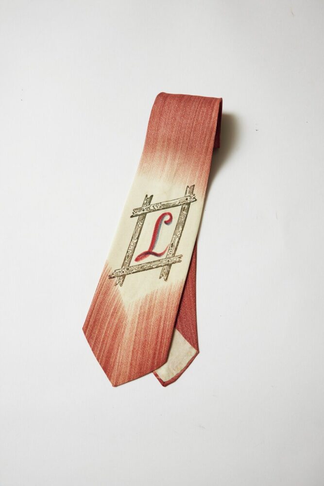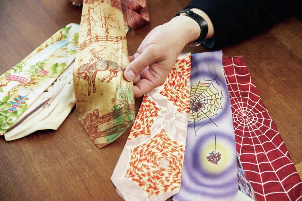 アイウエアに加え、この映画に関連するファッションアイテムとして西崎さんがコレクションしているもうひとつのプロダクトがプリントタイだ。蜘蛛の巣やウエスタンのモチーフ、所有者のイニシャルなどがハンドプリントされたヴィンテージタイは20代後半から集め始めたといい、西崎さんが所属するバンドのステージ衣装として着用することもあるのだとか。Vゾーンに威厳をもたらす幅広のデザインで、素材はレーヨンやシルク、そしてほとんどがアメリカ製だ。