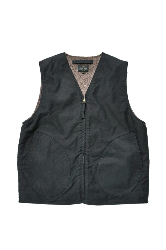 かつてのデッキジャケットから着想を得て作り上げた、デッキベスト。レイヤードすることで、保温性を高めることができる。ライダースの上から羽織れば、一味違うコーデを楽しむこともできるはずだ。ピケ素材を採用し、裏地にはウールアルパカ混の生地を採用している。3万5200円