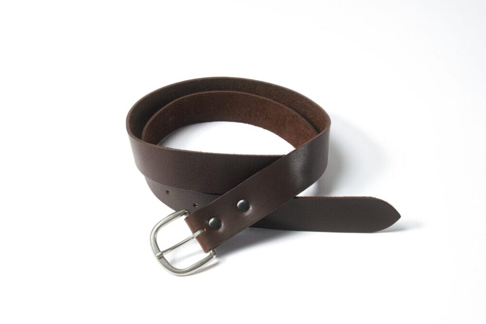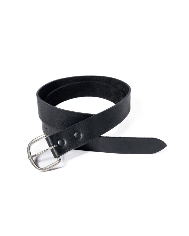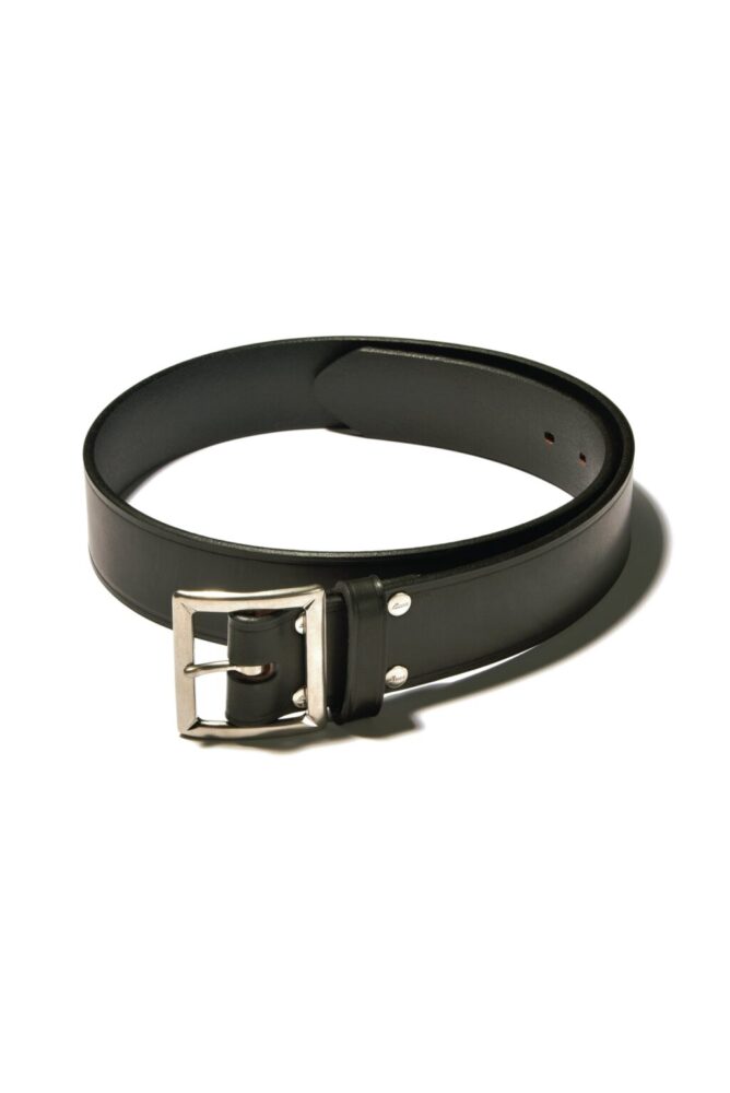 厚さ5㎜のカウハイドレザーとニッケルメッキを施した鉄製バックルを使用したシングルピンのベルト。 シンプルなデザインにBUCOの刻印入りリベットが程よい存在感。2万7500円