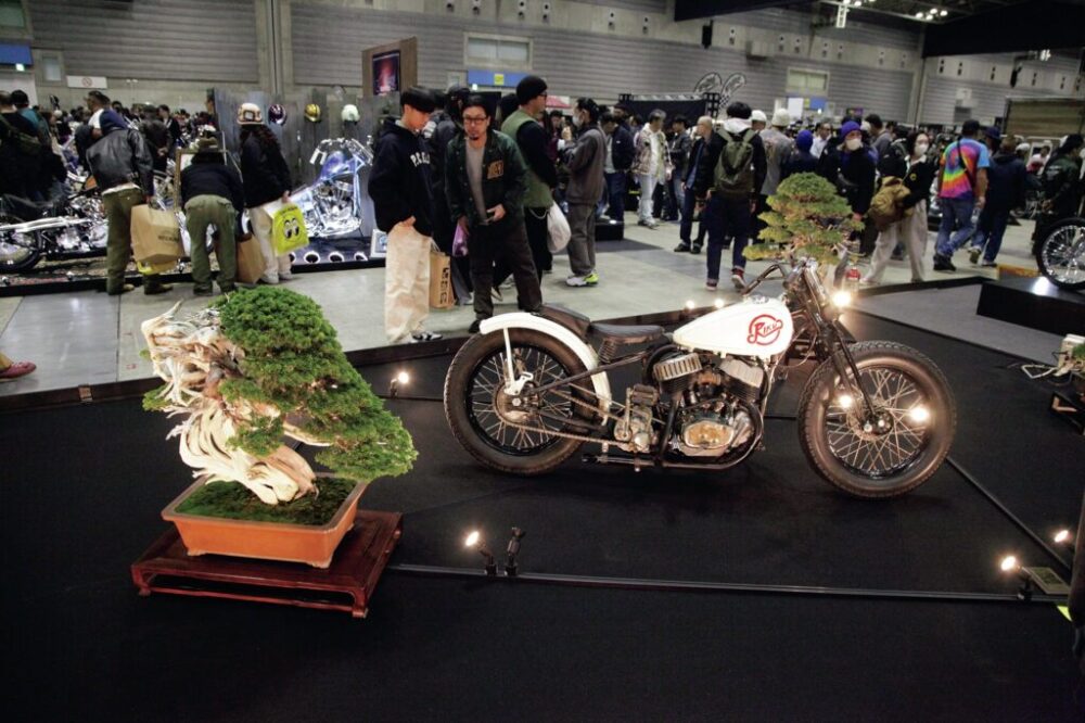 FIRST ARROW’s伊藤さんが持ち込んだのは、’55年式の陸王RQベースのトラックレーサー。ただならぬ雰囲気を醸し出す盆栽とともにディスプレイ。