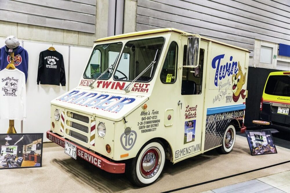 横浜のバーバー、MEN’S TWINがAM GENERAL社製のデリバリーバンをベースに自社のロゴを入れアイスクリームトラック風の看板カーに仕上げた。