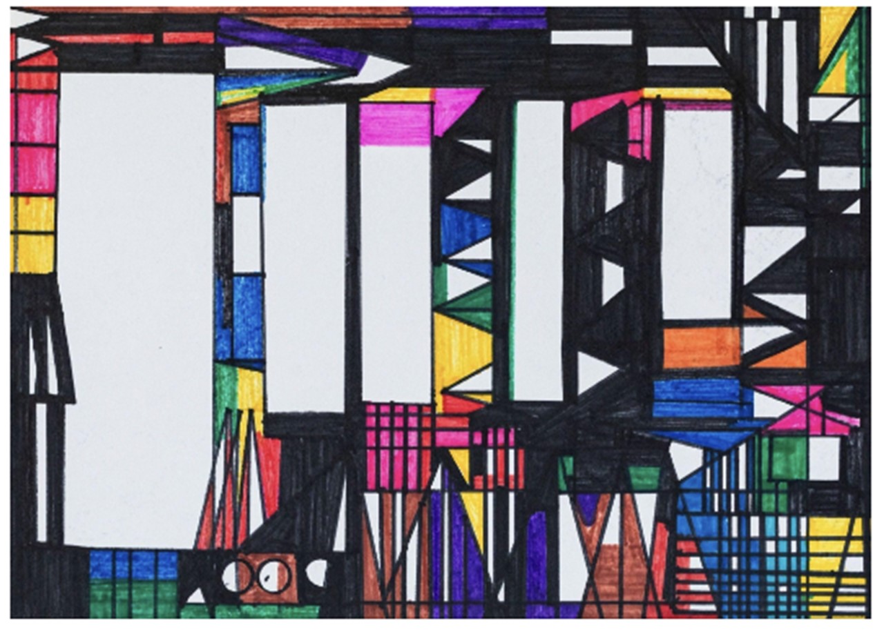 ⾊鮮やかな作品の中に、目を引く四角や丸の⽩い空間。