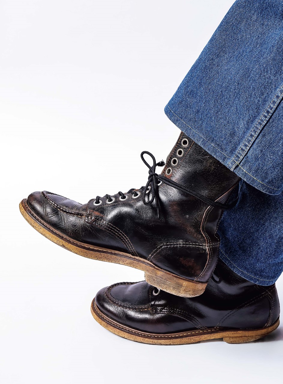 「茶芯のブーツにはあえてブラックのクリームを塗り、茶芯を活かしつつ、自分の好きな色合いに仕上げます。茶と黒が混ざり合った絶妙なカラーにグッときますね。いわば、自分だけの茶芯を作るイメージ。茶芯は経年変化がわかりやすいのが特徴であり魅力だと思うけれど、そこに一手間加えることこそ、茶芯ならではの楽しみ方だと思います。ワイドなジーンズやワークパンツと合わせてグランジ・ファッションに仕上げるのがこのブーツを履くときのマイルールです」