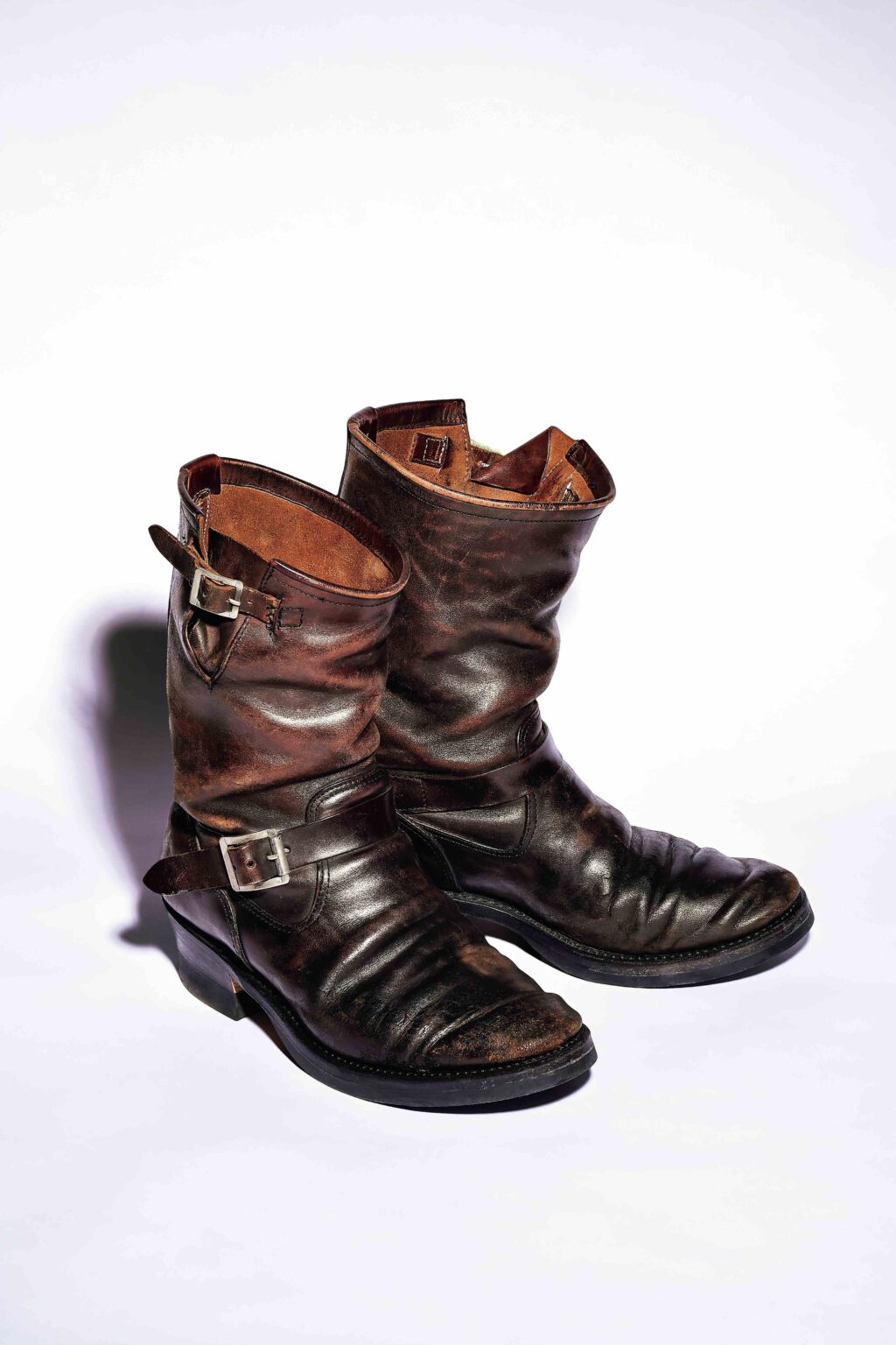 「そもそもエンジニアブーツはバイク用ではないが、’50年代好きとして、バイクに乗るときはエンジニアブーツを履くことが基本。茶芯の荒々しいエイジングが’50年代のスタイルをより一層格上げしてくれていると思います。ブーツはバイクに乗るための道具だと思っているので、メインテナンスはたまに行うくらいで、武骨に履いて、茶芯ならではのエイジングを楽しんでいます」