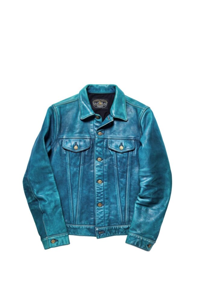 デニムジャケットのインディゴの色落ちをコンセプトにに、特製のタンニング剤や水洗いを施すことで下地の芯を白に変色させ、仕上げのアニリンは深海の色味をイメージ。擦れや皺など、あたりがつく部分は地色がうっすらと浮がりブルー×ホワイト特有の色味の美しいエイジングを実現。ムラ感のあるブルーの表情も特徴だ。18万400円