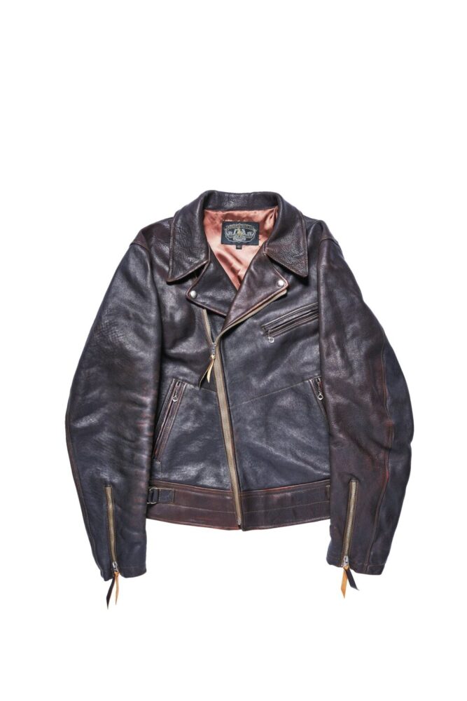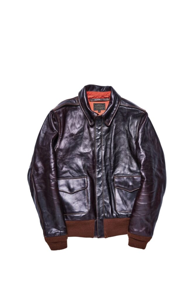 A-2の代表作の一つであるラフウェア社の23380をベースとし、身幅や袖をやや細めのフォルムにモディファイした1着。オイルとワックスを加え、アニリンで仕上げられたシールブラウンのホースハイドは、 艶や光沢が強く、やや赤みがかった色味が特徴だ。半年程度の着用ながら腕周りには色むらが現れ、着用者独自の表情に。18万7000円