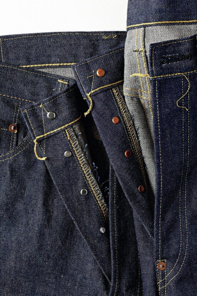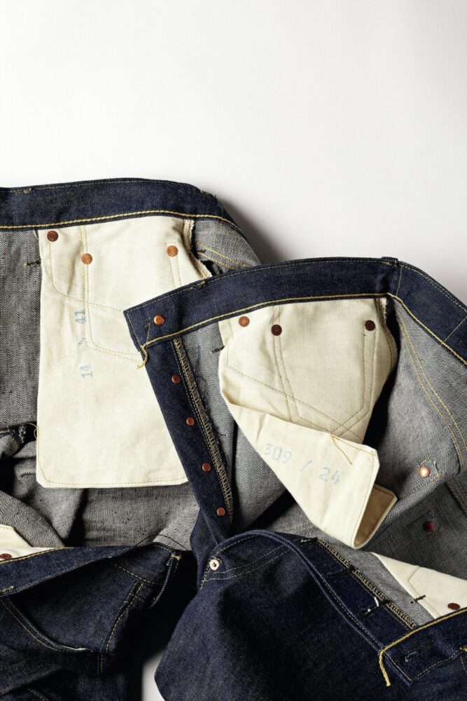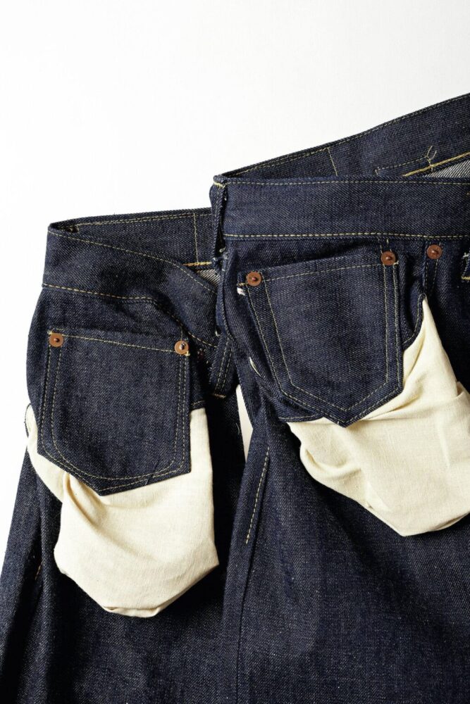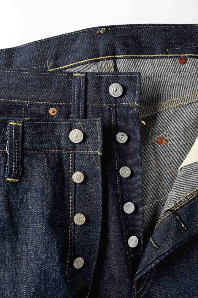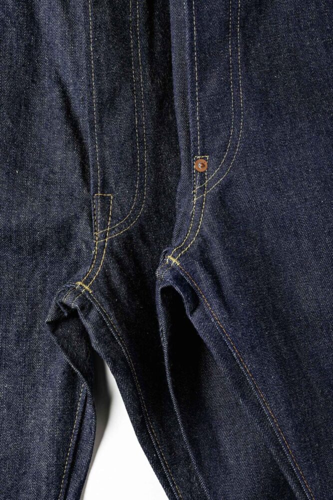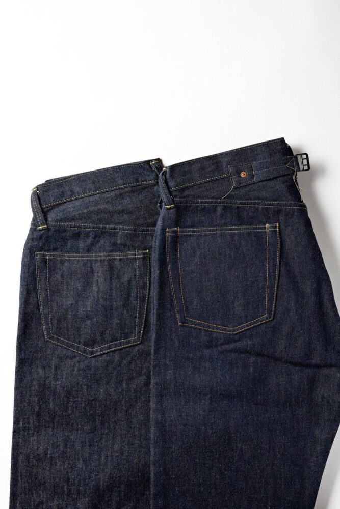 1942年モデルはパーツが制限される直前の個体のため股リベットが付く。比翼のステッチのカーブ具合も、両モデルで微差があることが見て取れる。