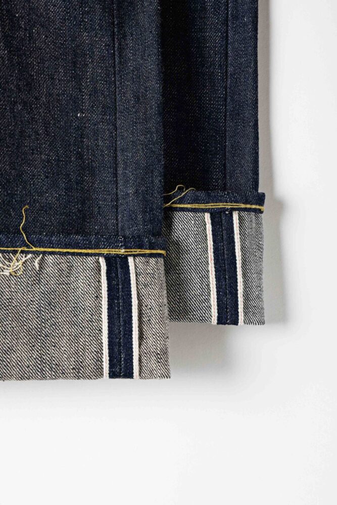シャトル織機で織ったスレーキには、青いインクでスタンプが押される。スタンプの内容や位置にいたるまでそれぞれのヴィンテージを踏襲している。