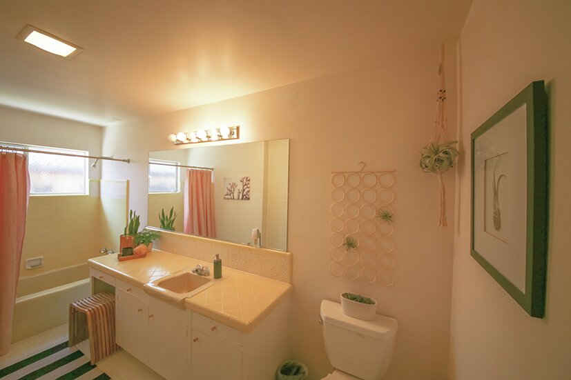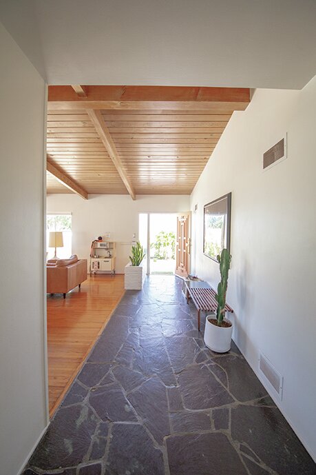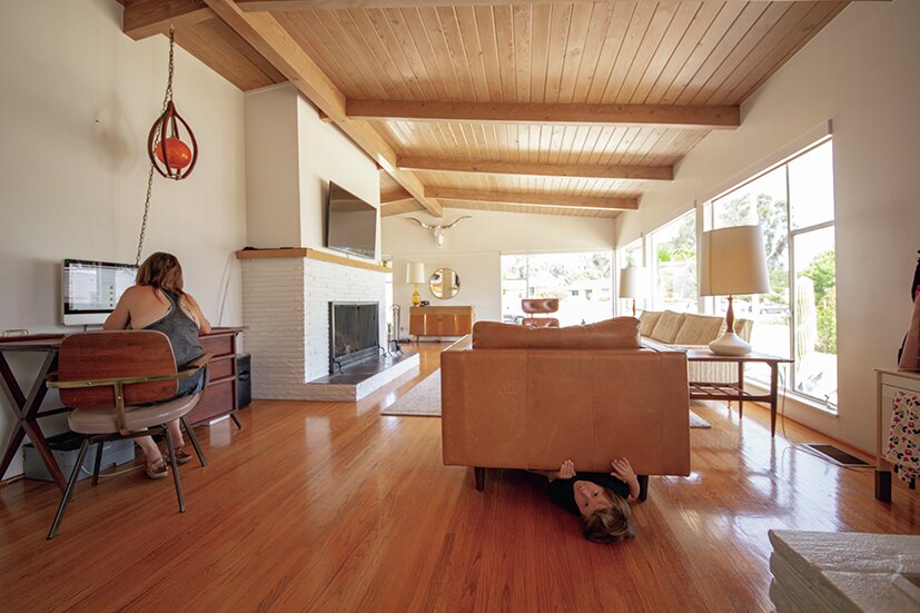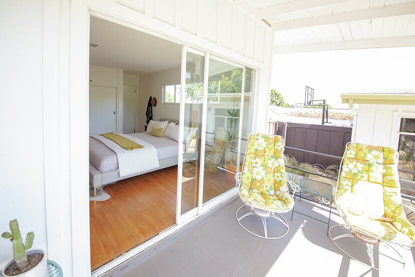 旧きよきアメリカ文化や豊かな街並みが色濃く残る海沿いの街、べンチュラ。その丘の上にある閑静な住宅街に佇むのはジョーイとタラが長年にわたって探し求めていた、1955年に建てられた素敵なミッドセンチュリーハウス。大きなガラス窓が特徴的なデザインのこの家は、周囲に他の家が建てられる前には、開放的なリビングからオーシャンビューがあったことが容易に想像できる。白とナチュラルウッドカラーのモノトーンで統一されたインテリアはファイヤープレイスやバスルーム、さらに彼らがチョイスしたコーヒーテーブル、カウチなどのファニチャーも含め、’50年代のテイストが完璧に再現されている素敵な空間だ。また当時のままでも使い勝手がよい部分がたくさんあったため無用なリノベーションは行わず、毎日使うキッチンと水周りにだけリモデルを施したそうだ。
