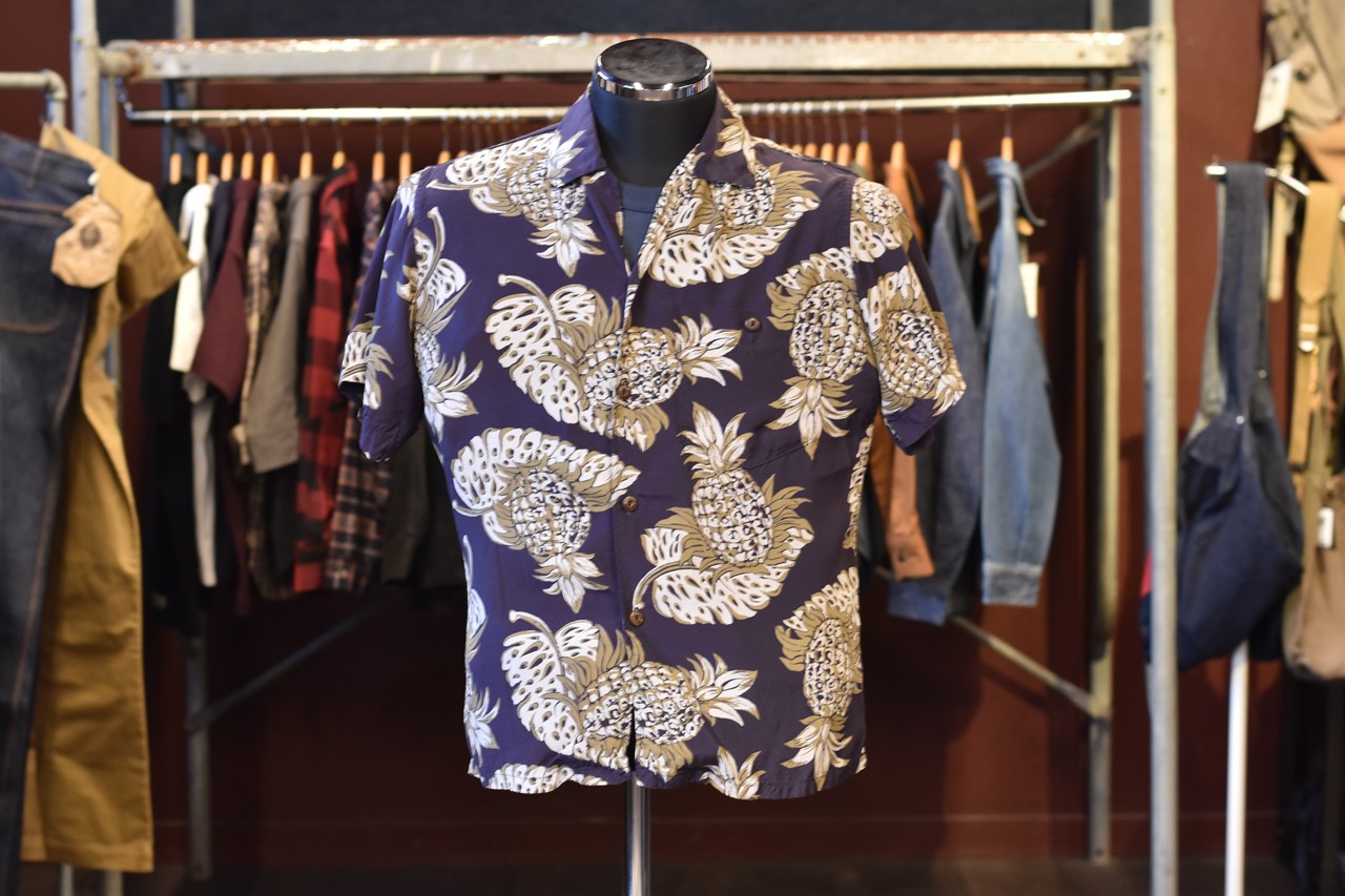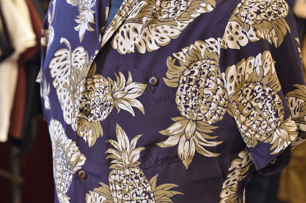 1950年ヴィンテージアロハシャツに実在した柄をリデザインしたパインリーフ柄。当時のリゾートブームを受けてサンフランシスコからハワイまでの船での航路「マトソンライン」が活発になったことで南国を想わせるデザインが広がった。この風潮を反映するかのようなパイナップルデザイン柄は数多く存在している。