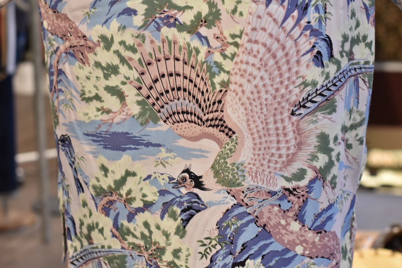 1970年に存在した実在の和柄デザイン。1970年ヴィンテージウエアでは平織コットンにこの和柄デザインが入り、エリ先に芯が入る仕様のモデルだった。もし1950年代にこの和柄デザインが存在したのであればという仮説から、100%レーヨンちりめんでリプロダクトしたモデルがAL-17。