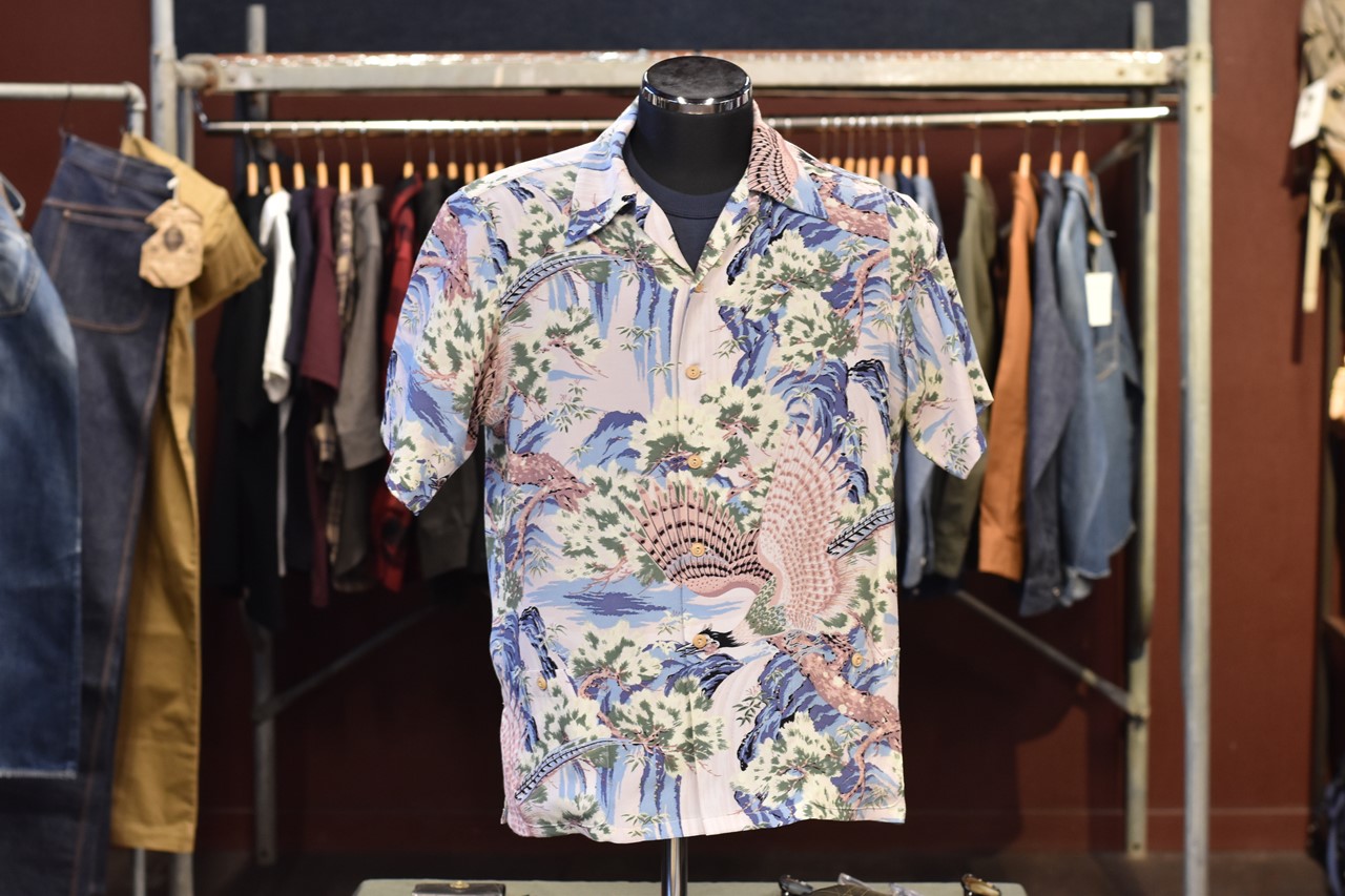 縦糸に強撚フィラメントレーヨンを張り、横糸にはS(右)撚2本、Z(左)撚2本を交互に打ち込み、織り糸の組合せでちりめん形状を創るファブリックと、職人の手捺染プリント11色により創り上げた本物志向のハワイアンシャツとなっている。現在この素材の貴重性も然ることながら、職人手捺染プリントの製造工程そのものが大変希少なもの。決して増えることのない技術の融合を是非その目と手で確かめてみてほしい。AL-17 31,680円(税込)