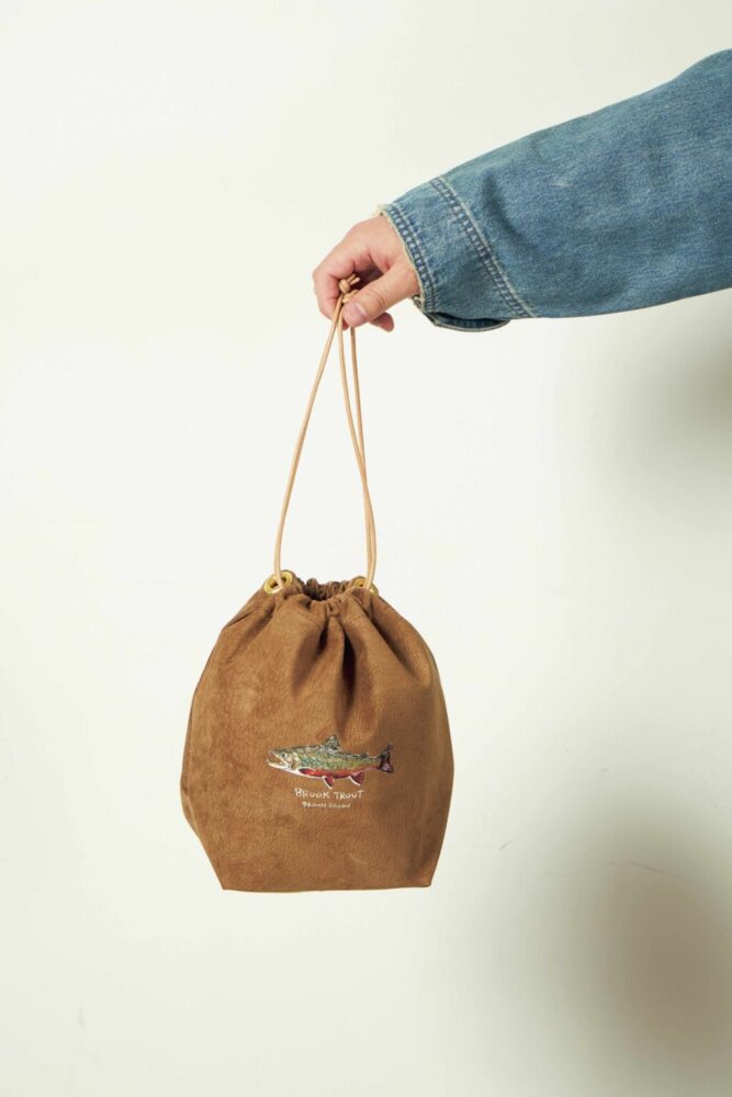 種類はアメリカ原産の「ブルックトラウト」。日本にも100年以上前に奥日光へ放たれたフィッシャーマン達に長い間愛されてきた魚です。イラストは『2nd』でガマ口財布にもペイントをしてもらったイラストレーターのイマイさん。この人の描く生き物の絵が好きなんですよね。もちろん、この巾着もハンドペイントで描かれています。それだけでも最高です。持つだけでテンションの上がる巾着バッグ、日本製の質の良いピッグスキンでこのコスパ。お好きな方おすすめです。