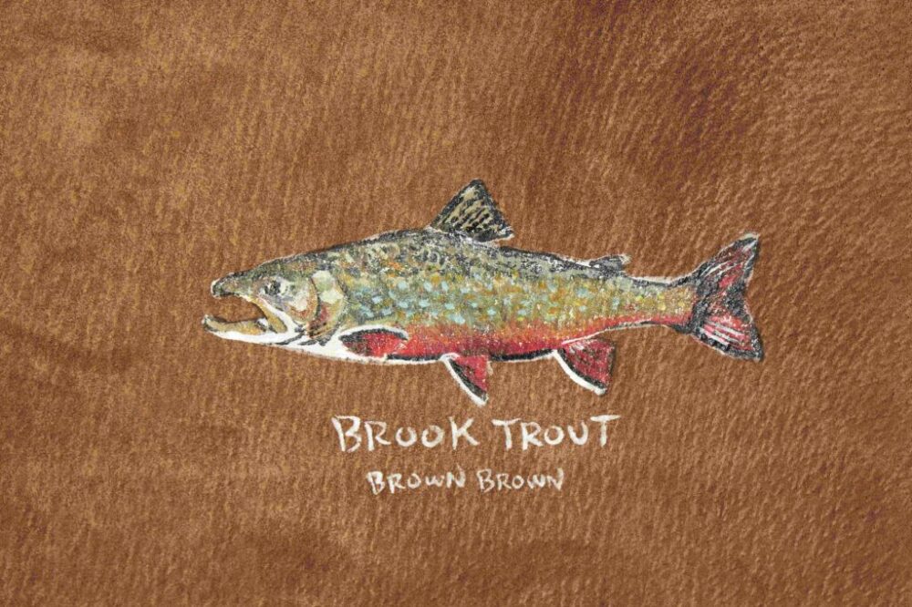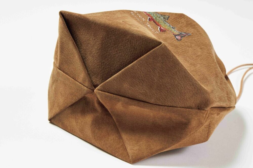コットン製やナイロンのもにも良いのですが、シンプルかつ持っていて、使っていてテンションの上がる、そして柔らかく使いやすい。ピッグスキンはそんな僕のわがままを一発で解決してくれました。マチもかなり広いので、見た目以上に荷物がたっぷり入るのも魅力。どこへいくのにも向いているオールラウンダーです。先ほどからサイズや素材について、話をしてきましたが、おそらくこのアイテムを見てお気づきの方もいらっしゃると思いますが、1番のポイントは中央に描かれたトラウトのイラスト。