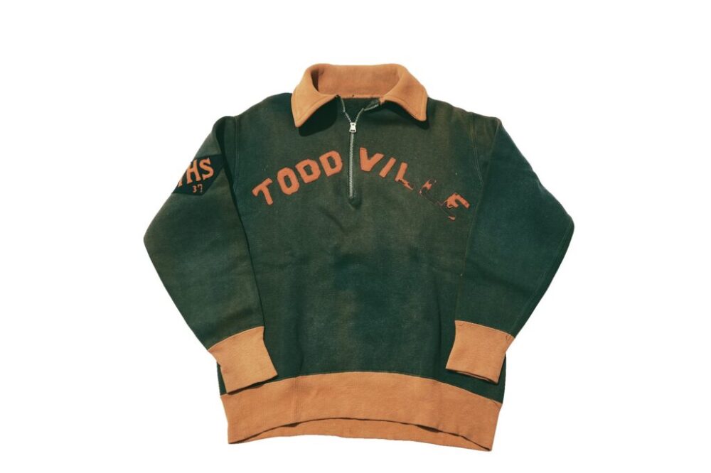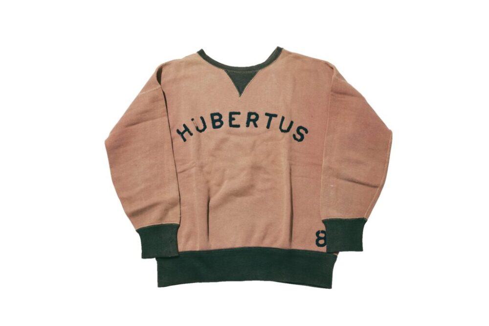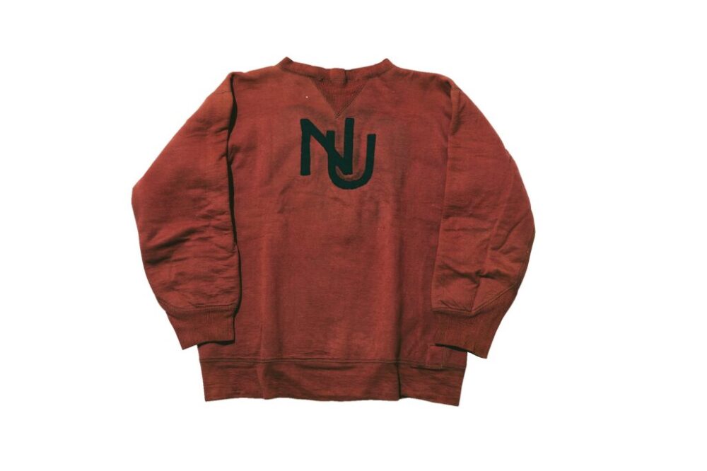 扇形のタロンジッパーを使用した1930年代半ばのスウェット。フェルトスウェットで多く見らるのはフロント部分のみだが、こちらは両面や肩にフェルトが施されている贅沢な1着。戦前のスウェットでは珍しいとされる。黒ベースのボディがポイントのひとつ。