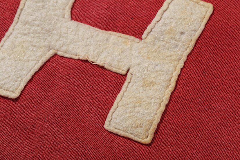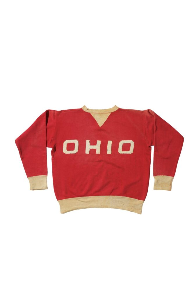 スクールカラーであるレッドをメインカラーとしたオハイオ州立大学のコットンスウェットシャツ。1938年のイヤーブックに学生が着用した姿が掲載されていることから、30年代半ばには存在したと推測される。フェルトレターも同年代を象徴する仕様だ。