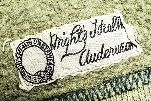 フェローズ設立後、最初のスウェットに付けられていた赤刺繍のブランドタグ。フロントにブランドロゴが染み込みブリントされた定番モデルはこの頃から存在する。