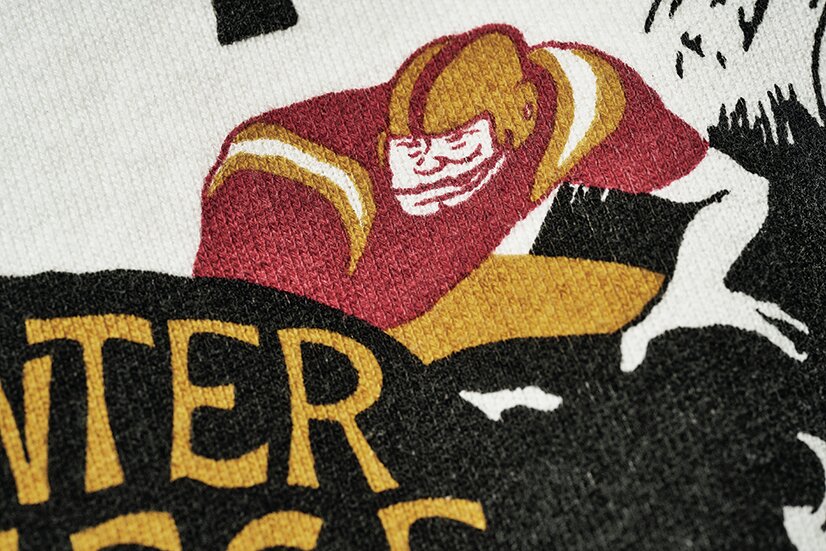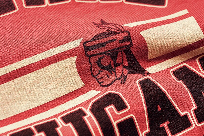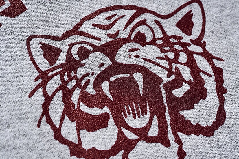 オリジナリティのあるカレッジ風デザイン。2色の染みこみプリントで仕上げている。