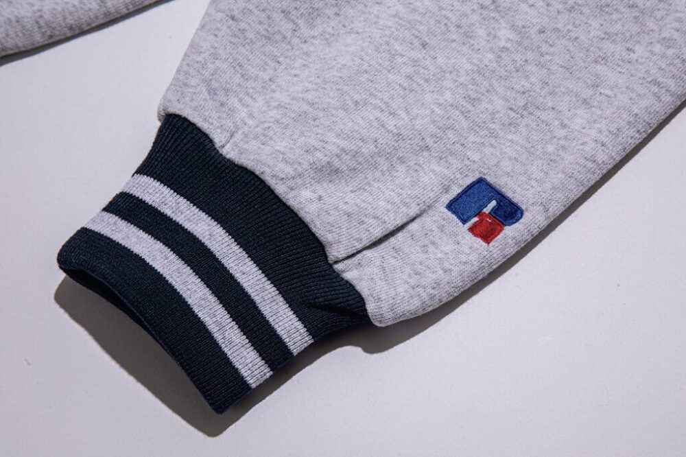 左袖にはラッセルアスレチックのロゴの刺繍を配置。シンプルなデザインのワンポイントに。