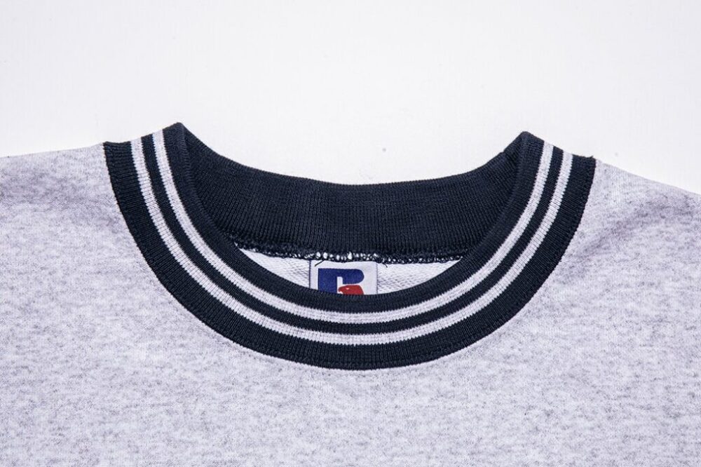 カレッジスタイルの定番であるストライブリブをネックと袖、裾に取り入れている。