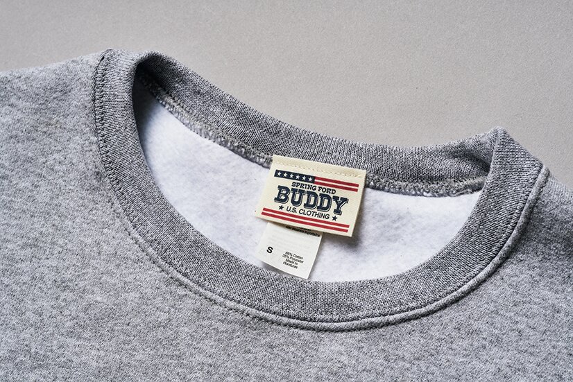 ベーシックなクルーネックを採用。生地はアメリカでよく使われている12ozの裏起毛を使用。
