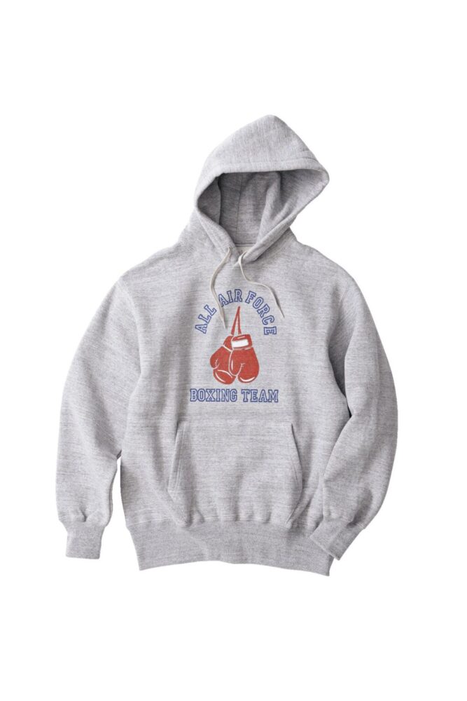 アメリカ空軍のボクシングチームが使用していたフーディを、染み込みプリント。旧式の吊り編み機を使用してゆっくりと作られる丸胴の生地を使い、1940年代から50年代のスウェットシャツの風合いを再現した。3万800円(ザ・リアルマッコイズ東京 TEL03-6427-4300)