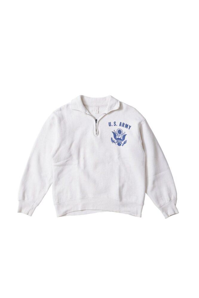 米陸軍の紋章が染み込みプリントされた襟付きハーフジップ。鷲の羽根は33枚で、13個の実と13枚の葉のついたオリーブの枝、そして13本の矢をそれぞれの足に握り、「戦争と平和」を表す。5万5990円(スパイク TEL03–6407-0123)