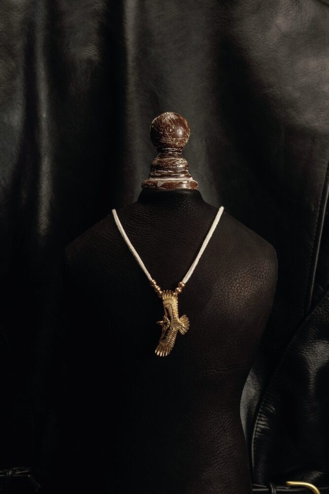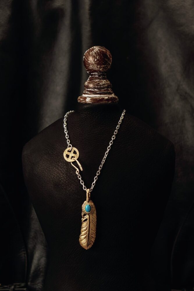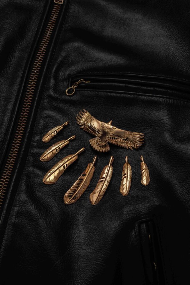 アリゾナフリーダムを代表するイーグルとフェザーのペンダントトップ。複数重ねることで圧倒的な存在感を放つ。※ゴールド製品はすべて時価。