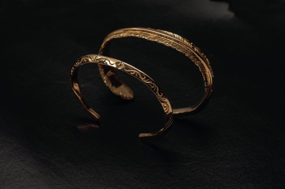アラベスクが打ち込まれた細身のバングルとフェザーをモチーフにしたいずれもゴールドを採用したバングル。華美すぎないシンプルさも良し。