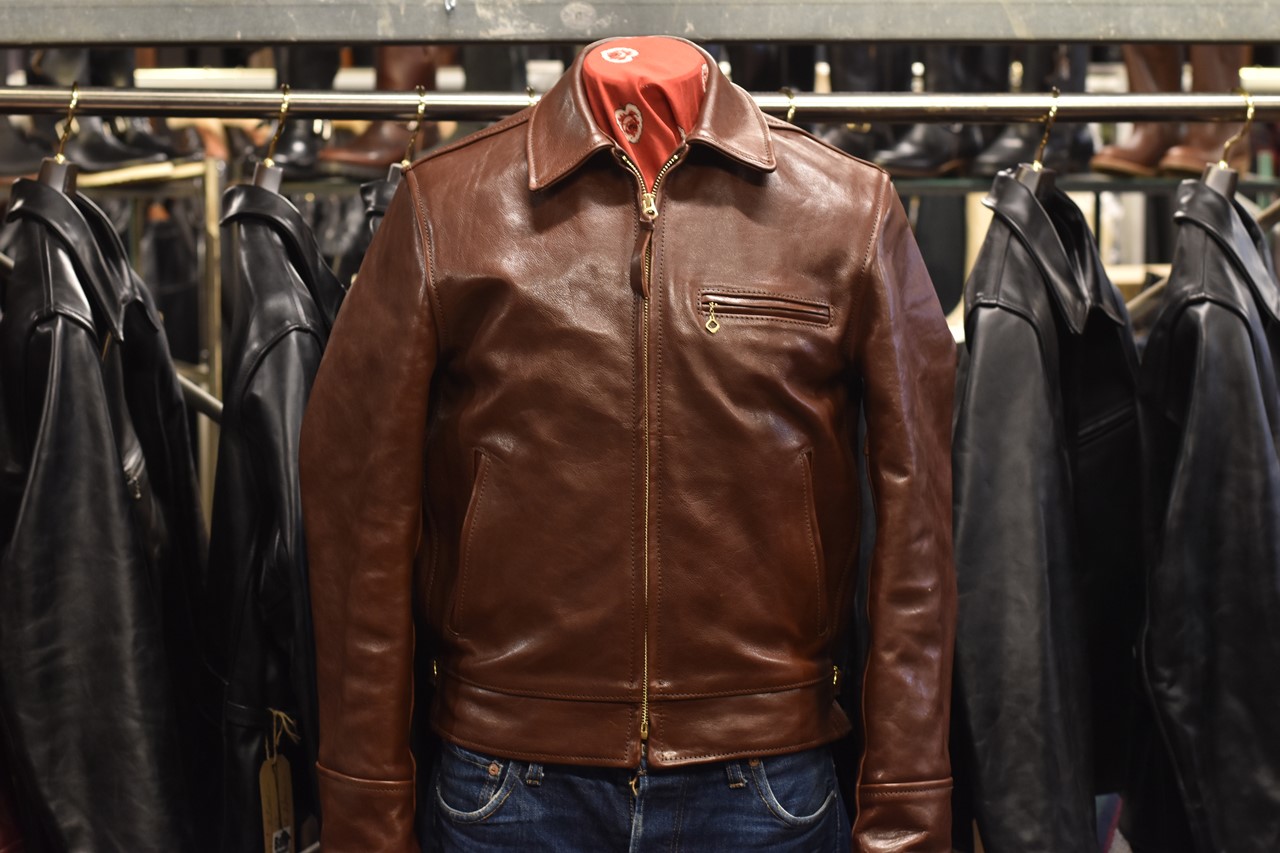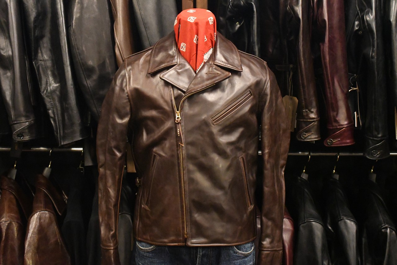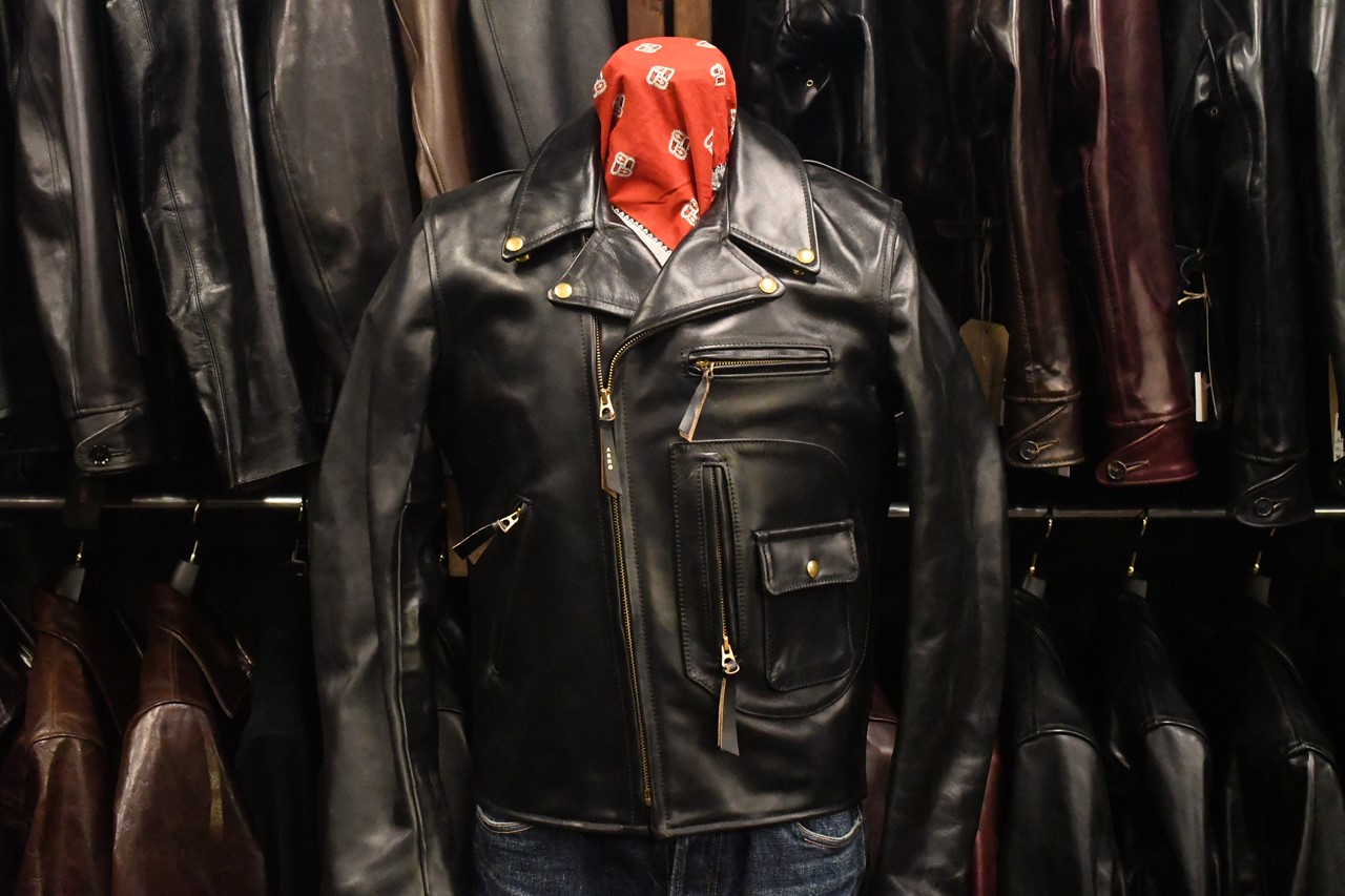 エアロレザージャパンとエアロスコットランドの共同製作による、ダブルショートジャケット「Bootlegger」のスーパータイトフィット(STF)バージョン。金具類が少ないため、シックで個性的な雰囲気を醸し出す。