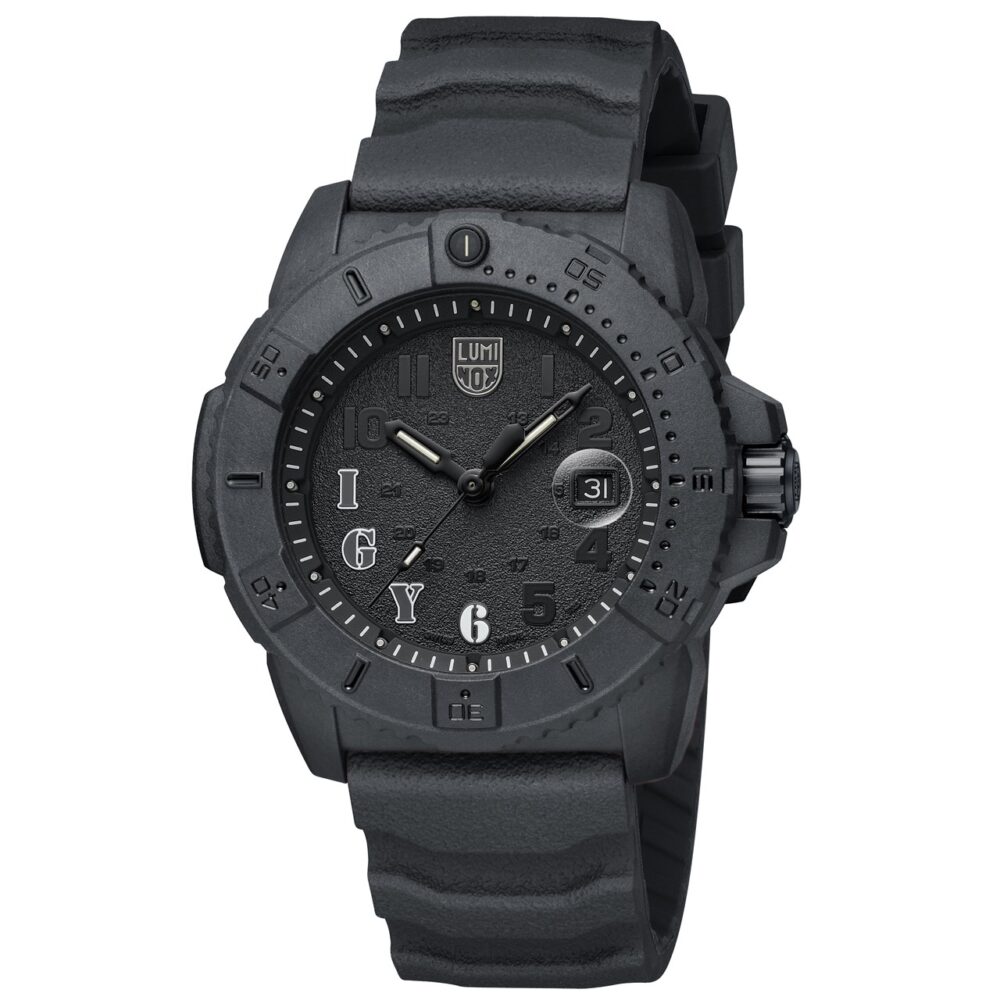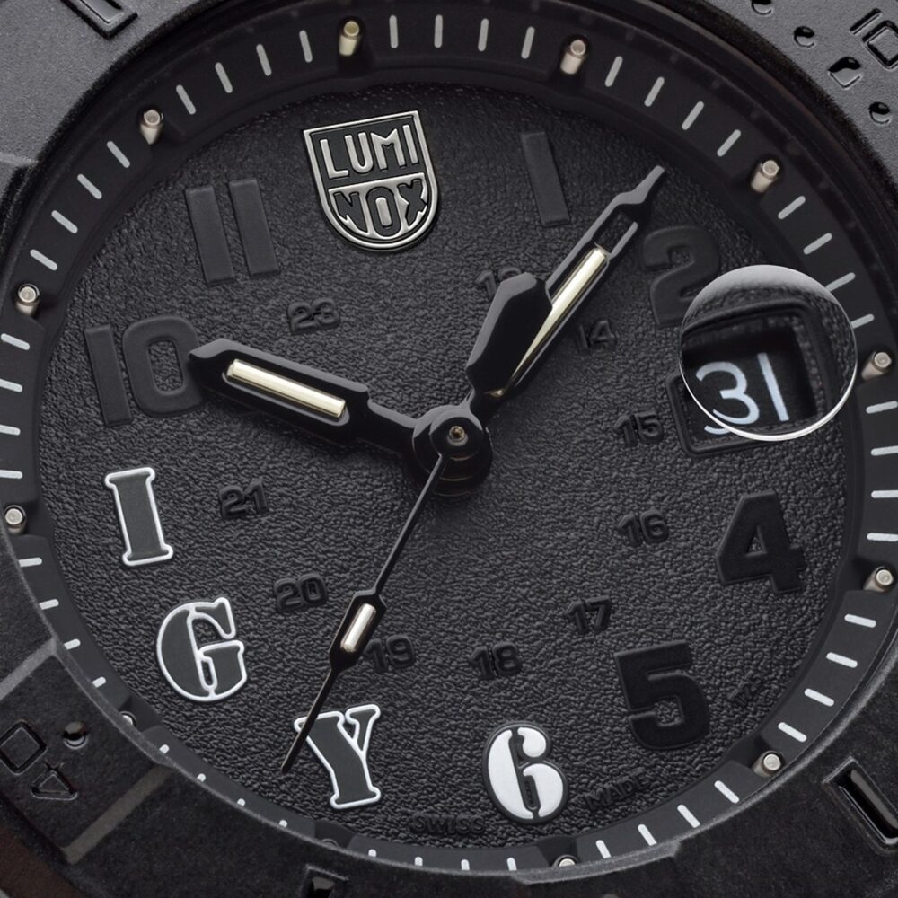 アイスブルーとイエローで垂直に配置された自己発光システム【ルミノックス・ライト・テクノロジー】に加えて、文字盤の6時~9時の間にある「IGY6」の刻印は、スーパールミノバ(R)になっているため、光源により蓄えた光を暗所や低照度環境で鮮やかに発光する。これはNavy SEAL Foundationの素晴らしい活動に敬意を表しているだけでなく、高い視認性を誇っている。