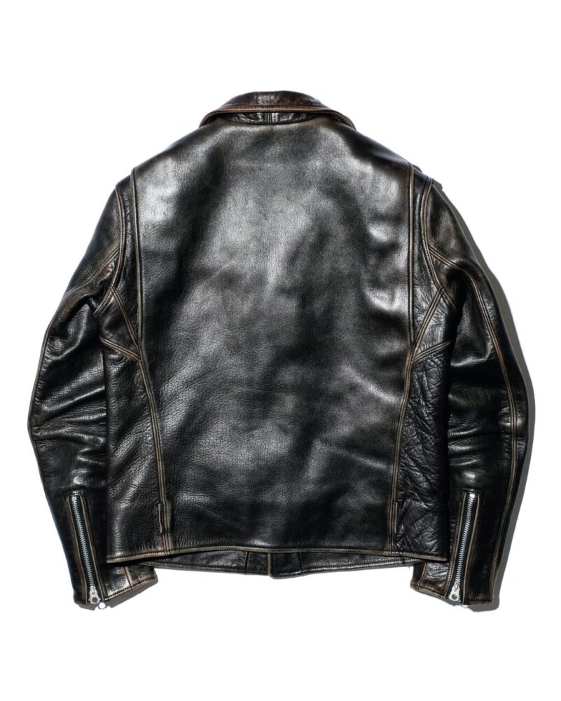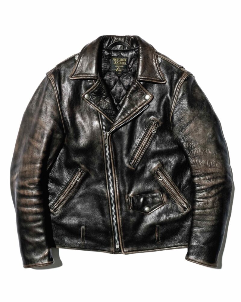 王道のダブルライダースジャケットをベースに、1950〜’70年代のディテールを取り入れ、ファインクリークが思う理想のダブルライダースを作り上げたのが、このレオン。1.8㎜厚のフルベジタブルタンニン鞣しのホースハイドを採用し、まず芯通しで茶の水性染料で芯通しで染め、その後、芯まで染めずに黒で丸染めした、いわゆる“サンドウィッチ“仕様の茶芯となっている。着込むほどにうっすらとした“面“で出現する茶芯が楽しめ、その様はさながらヴィンテージのようでもある。20万6800円〜