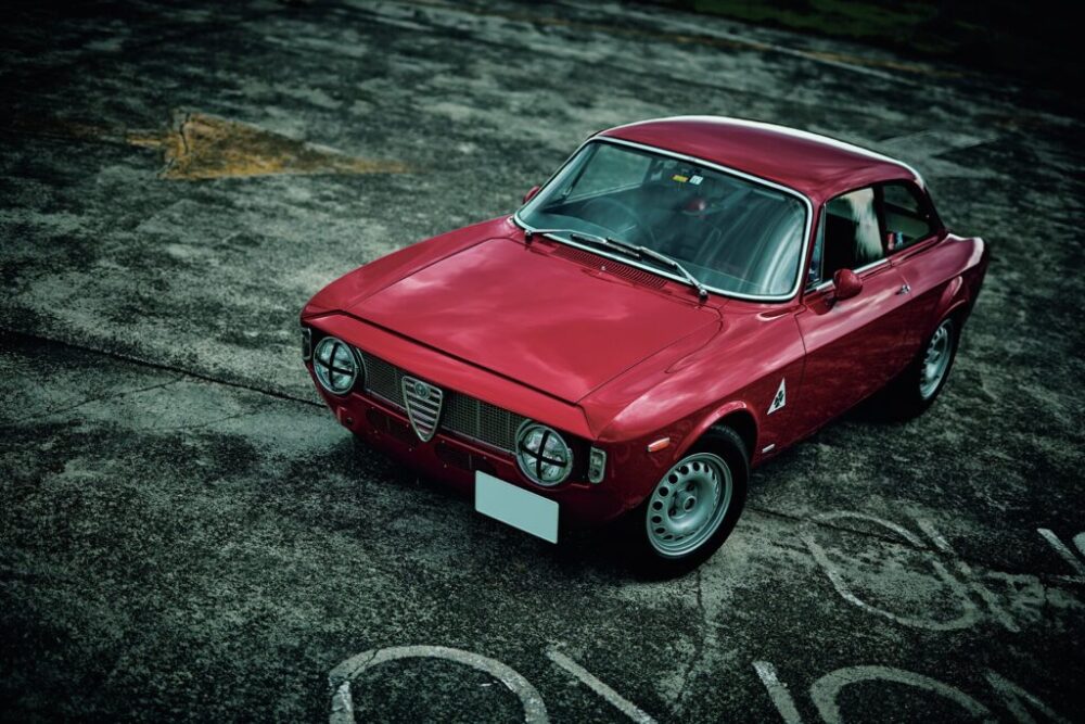 アルファ・ロメオ・ジュリア・スプリントGT(1963年デビュー)。徴兵中のイタリア軍キャンプで仕上げたモデルで、“寄り目”のデザインが特徴。