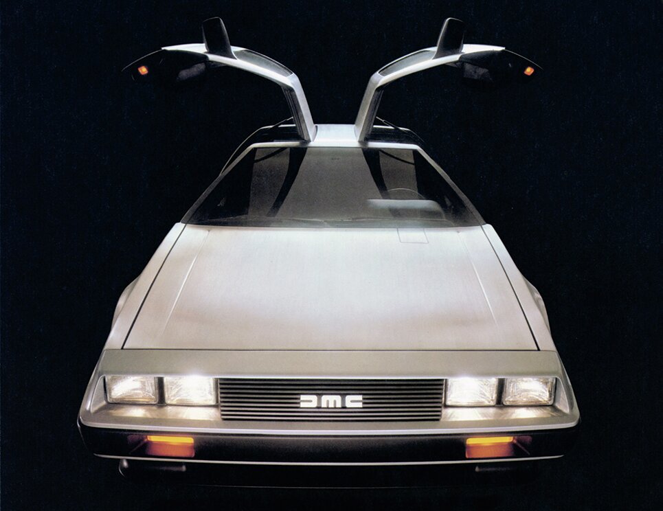『バック・トゥ・ザ・フューチャー』に登場したDMCデロリアン(1981年)。ガルウイングドアのボディを採用し、そのボディパネルにはヘアライン加工された無塗装のステンレス鋼が使われている。