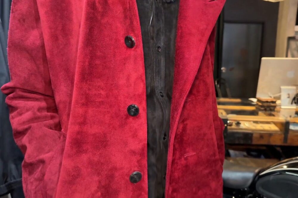 表革ではなく、裏革(スエード)を使うことで、レザーの持つ“重たさ“を感じさせないのがポイント。軽い乗り味のメグロを、スエードコートで軽やかに乗る。それこそ今のTOKYOのストリートバイカースタイルなのかもしれない。