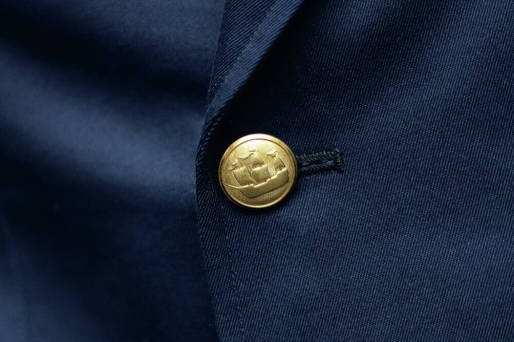 ブレザーの顔ともいえるボタンにはオリジナルのゴールドメダルボタンを使用。ブランドロゴである帆船のモチーフが刻まれている。