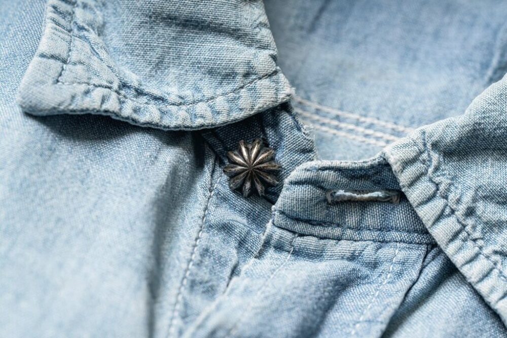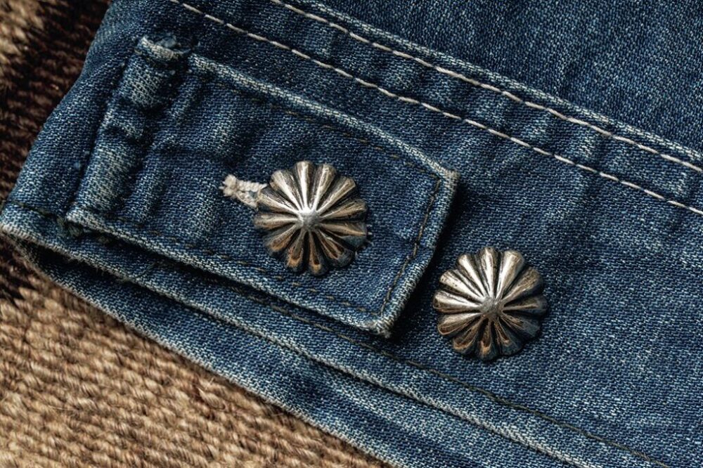 自身が着込んだシャンブレーシャツは、’60年代頃のヴィンテージ。シンプルなボタンだったので、コンチョボタンに変更した。